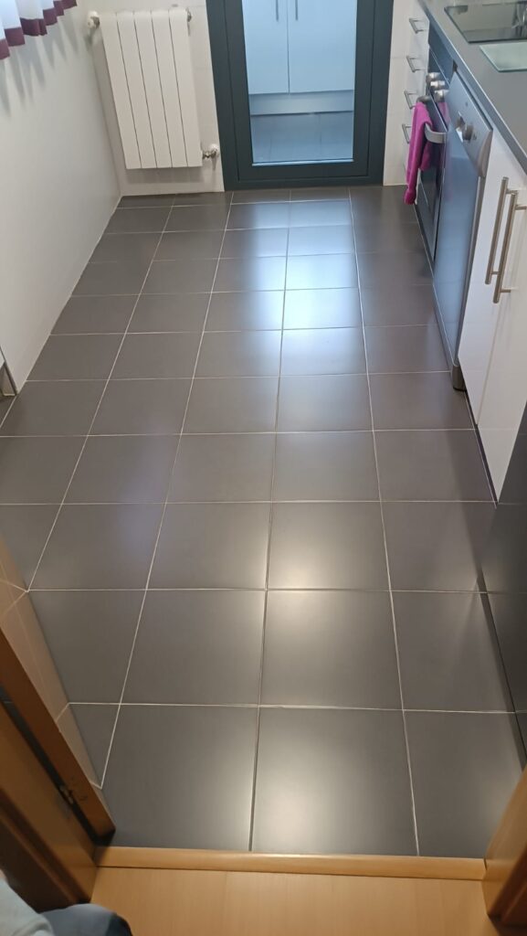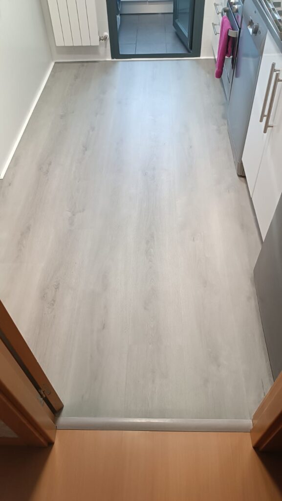 El proyecto ha consistido en la instalación de tarima flotante vinílica de alta gama directamente sobre el suelo existente. La nueva tarima presenta un diseño de lamas anchas imitando madera en un tono gris claro y luminoso. El cambio no solo es estético, aportando calidez y modernidad al espacio, sino también funcional, ya que el vinilo ofrece una superficie continua, impermeable y más confortable, perfecta para una zona húmeda y de alto tráfico como la cocina.